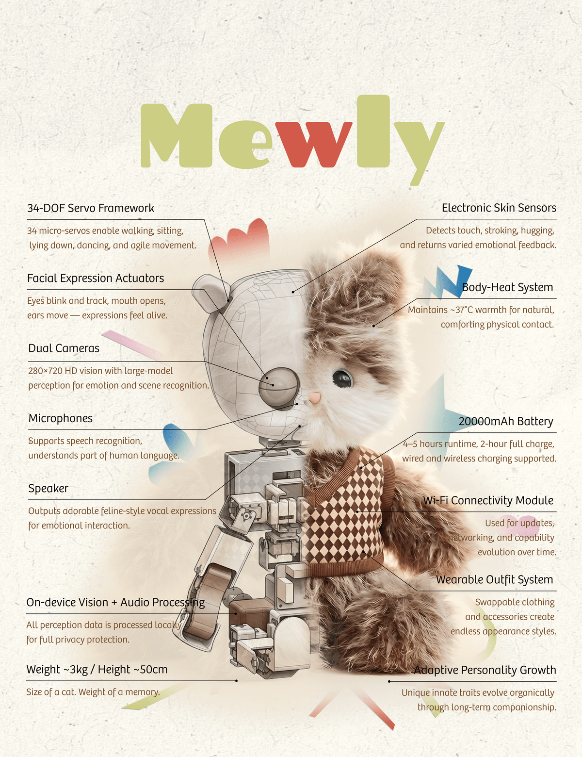 · 34 degrees of freedom + 37°C constant body temperature — recreating authentic feline-like biomechanical movements.